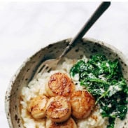 This feels-like-a-fancy-restaurant meal combines the love that is a pile of creamy Parmesan risotto (with a splash of white wine bcz this is a fancy restaurant, remember?) and seared scallops, garlic sautéed greens, and THEN, like we weren’t already 😍😍😍 enough, the brown butter gets drizzled all up on top of everything. Just so you can go to heaven and back again in one bite.