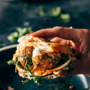 This whole thing comes together shockingly easy, especially if you use a little blitzer like this guy (affiliate link) to mince all the meatball mix-ins! The meatballs will beg to be eaten straight out of the pan as an “appetizer” before you even get to the sandwich, but once you do get there, you can use any number of types of bread – soft French bread or baguette or pita, for example – to build the sandwich. It might be a bit low brow, but my bread-y element of choice is that pillowy, pre-made store-bought naan. Stuffed with all this goodness and folded into a naan-wich… oof. It’s just really good.