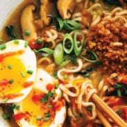 Simmering some garlic, ginger, and dried mushrooms with your chicken broth makes for a great quickie “stock” for your soup base. A good while in the pot will get some nice flavors going that will soon be soaked up by those noodles. And by good while, I mean 19 minutes, because the whole thing takes 20. The soft egg on top will get you all the Instagram likes, and the panko and extra chili oil or Sriracha will light your mouth up with joy.
