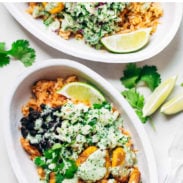 Source notes: This recipe was previously titled “Spicy Brazilian Burrito Bowls” but was updated in August 2021 to better reflect and respect the cultural origins from which this dish came from. While this burrito bowl was inspired by a delicious Brazilian-inspired restaurant meal I had, it is not a traditional Brazilian dish. Just a delicious fusion of fried plantains, spicy sauce, rice, beans, and all the fixings!